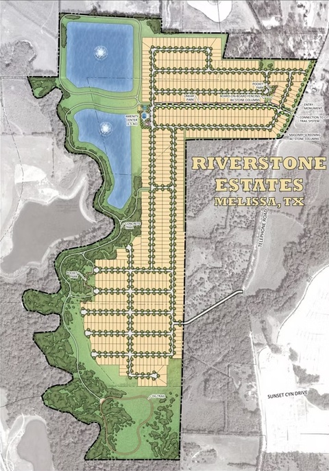 Riverstone Estates is a thoughtfully planned 268-acre residential community in Melissa, Texas, offering a total of 652 single-family homesites designed to give families room to grow and thrive. Ideally located just 0.5 miles west of U.S. 75 and one mile south of the Collin County Outer Loop, the community provides convenient regional access within one of the nation’s fastest-growing areas. Residents will enjoy a robust amenity program, including a large community center for gatherings and recreation, along with 3.2 miles of walking and biking trails that wind around two scenic ponds. Homes in the first phase will be built by Perry Homes, Drees Custom Homes, and Homebound on a mix of 50-foot and 60-foot lots, and the community is proudly served by the highly regarded Melissa Independent School District.